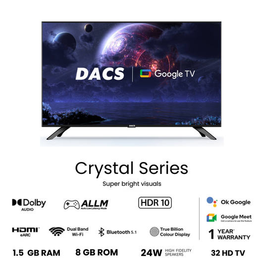 DACS Crystal Premium 32" QLED Google TV with 24W Dolby Audio & 1.5 GB RAM (Metallic Bezel Less,2025)